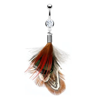 Piercing pupíku. Dřík piercingu má rozměr 1,6*10mm, průměr vrchní kuličky 5mm, průměr spodní kuličky s kamínkem 8mm. Piercing je zdobený barevným peřím. Délka ozdoby cca. 60mm, šířka ozdobného peří cca. 40mm. Velmi netradiční piercing do pupiku se kterým jistě zaujmete.