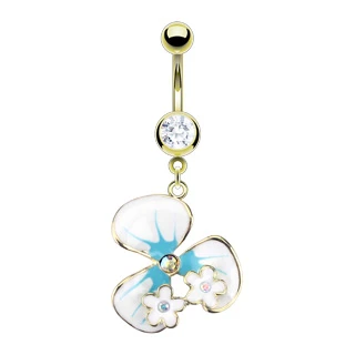 Piercing do pupíku. Dřík piercingu je vyrobený z pozlacené chirurgické oceli 316L. Ozdoba piercingu barvená a pozlacená bižuterie. Rozměry dříku: délka 10mm, průměr 1,6mm. Ozdoba piercingu má rozměr 23*23mm. Netradiční pozlacený piercing do pupíku.