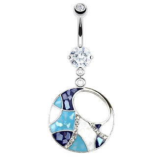 Piercing pupíku. Piercing s ozdobou. Dřík piercingu a šroubovací kulička jsou vyrobeny z chirurgické oceli 316l, ozdoba je vyrobená z porodiované a barvené bižuterie s částečkami perleti. Dřík piercingu má průměr 1,6mm, délku 10mm. Průměr šroubovací kuličky 5mm. Průměr ozdoby 21mm.