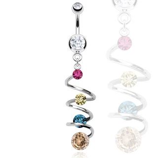 Piercing pupíku. Dřík piercingu je z chirurgické oceli 316l. Ozdobné je z porodiovaná bižuterie. Ozdoba je osazená barevnými kamínky. Průměr horní šroubovací kuličky 5mm, dolní kulička má průměr 8mm. Dřík piercingu má průměr 1,6mm, délka dříku piercingu 10mm. Ozdoba má rozměr 35x10mm.