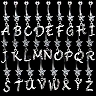 Piercing do pupíku. Dřík piercingu je z chirurgické oceli 316L. Ozdoba piercingu je porodiovaný obecný kov. Piercing je ozdobený zirkony. Rozměry dříku 1,6*10*5*8mm, ozdobné písmeno 11*8mm.