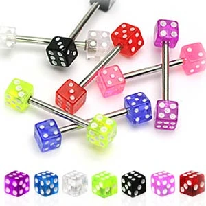Piercing do jazyka. Dřík piercingu je vyrobený z chirurgické oceli 316L. Ozdobné kostky jsou z bioplastu. Rozměry piercingu 1,6*16*5mm.