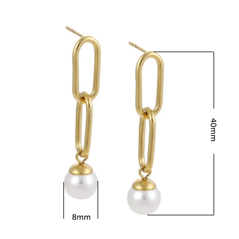 Visací náušnice z chirurgické oceli s perlou. Náušnice jsou pozlacené technologií PVD. Bílá přírodní perla má průměr 8mm. Celková délka náušnice 40mm. Náušnicové zapínání je na puzetky. Uvedená cena platí za pár.