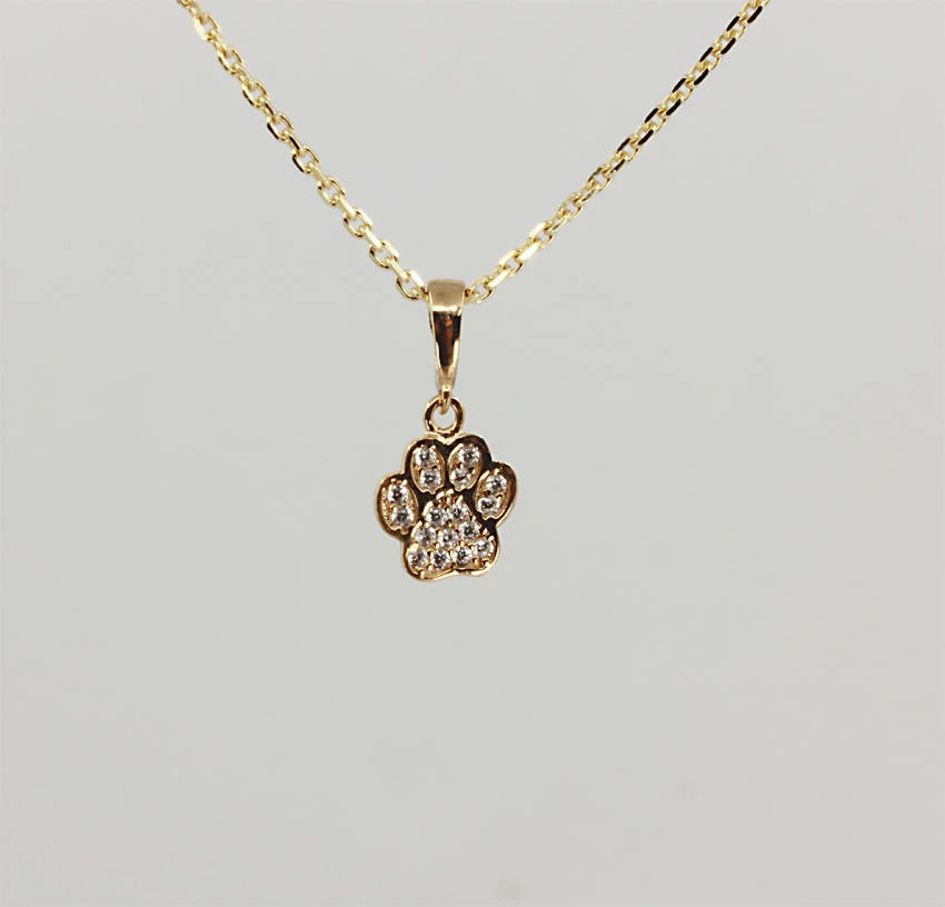 Stříbrný pozlacený přívěsek na řetízek "psí packa" ozdobený prvotřídními zirkony. Přívěšek je vyrobený ze stříbra ryzosti 925/1000. Rozměr přívěsku 9x8mmmm. Závěsným očkem na přívěsku lze provléct stříbrný řetízek s průměrem do 1,5mm.