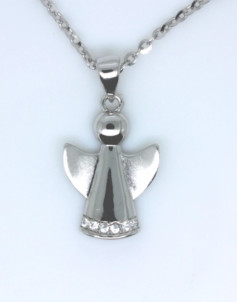 Stříbrný přívěšek anděl se zirkony. Povrch přívěsku je porhodiovaný. Úprava rhodiováním zamezuje přirozené oxidaci stříbra a současné dodává přívěšku zářivou barvu s leskem. Závěsným očkem lze provléct stříbrný řetízek s maximálním průměrem 2,5mm. Rozměr přívěšku 14x14mm.
