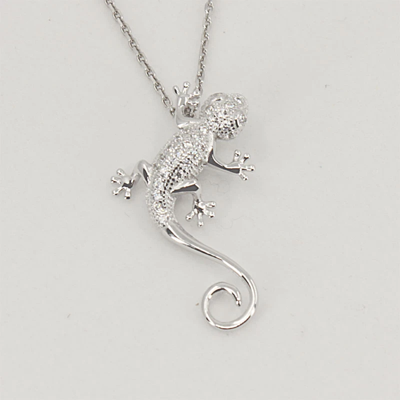 Přívěsek na řetízek ještěrka ze stříbra 925/1000. Ještěrka je osazena prvotřídními zirkony. Povrch přívěsku je porhodiovaný. Úprava rhodiováním dodává přívěsku jasnou barvu s leskem, zvyšuje odolnost povrchu proti poškrábání a zamezuje přirozené oxidaci stříbra. Přívěsek tak bude mít po dlouhou dobu bezvadný vzhled. Rozměr přívěsku 23x23 mm. Závěsným očkem na přívěsku lze provléct stříbrný řetízek s průměrem do 3 mm.