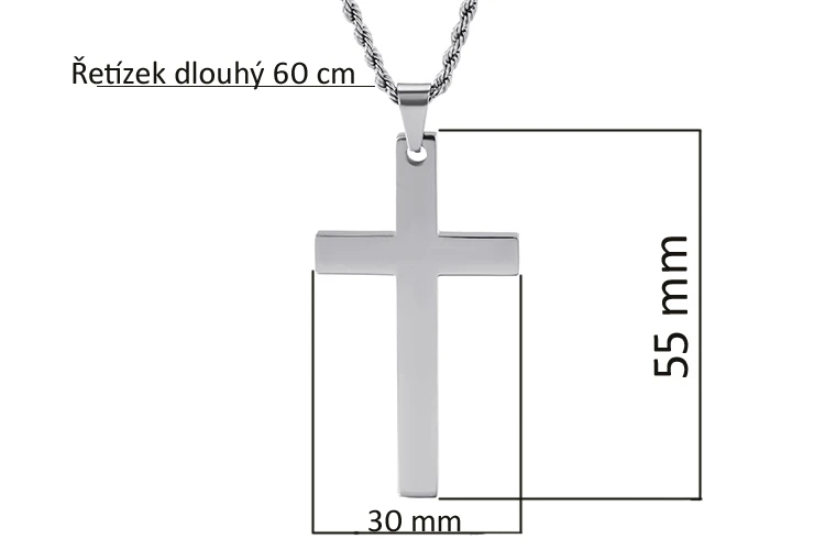 Přívěsek z chirurgické oceli křížek s ocelovým řetízkem typu pancr. Řetízek se zapínáním na karabinu je dlouhý 60cm. Rozměr kříže 30x55mm. Přívěšek křížek a řetízek mají leštěný povrch.