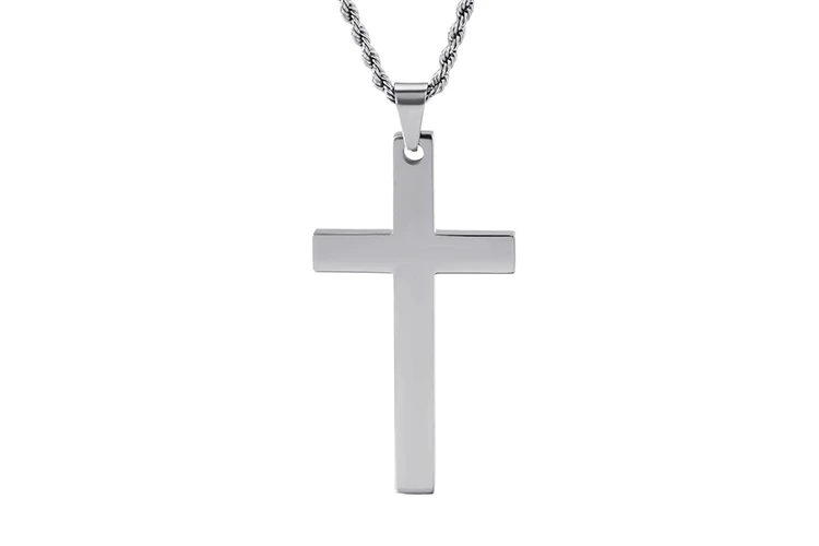 Náhrdelník z chirurgické oceli kříž. Jako všechny ocelové šperky je také tento náhrdelník ve srovnání se šperky z jiných kovů ocelný proti poškození, nemění barvu, neoxiduje a nevyvolává alergické reakce.