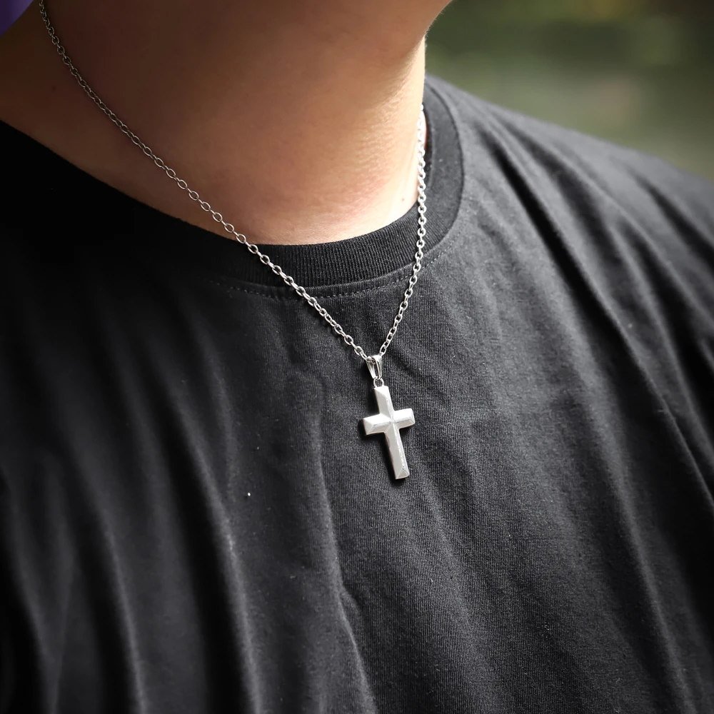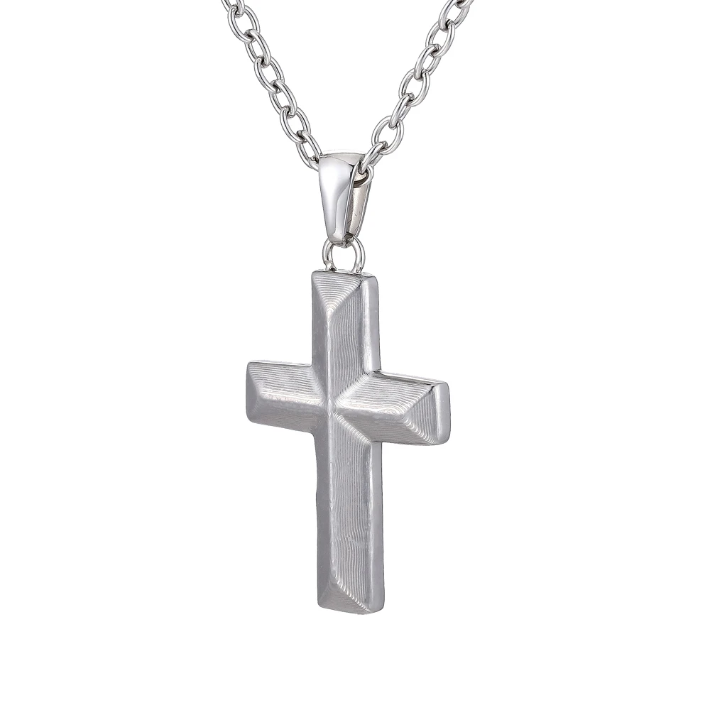Přívěsek křížek z damascénské oceli. Křížek má díky použité technologii známé po celá staletí krásnou kresbu po celém povrchu, způsobenou spojováním vrstev při teplotě 1400°C. Rozměr křížku 31x20mm, Závěsným očkem na přívěsku lze provléct řetízek s maximálním průměrem 3mm. Ke křížku náleží řetízek z chirurgické oceli dlouhý 55cm o průměru 2,5mm.