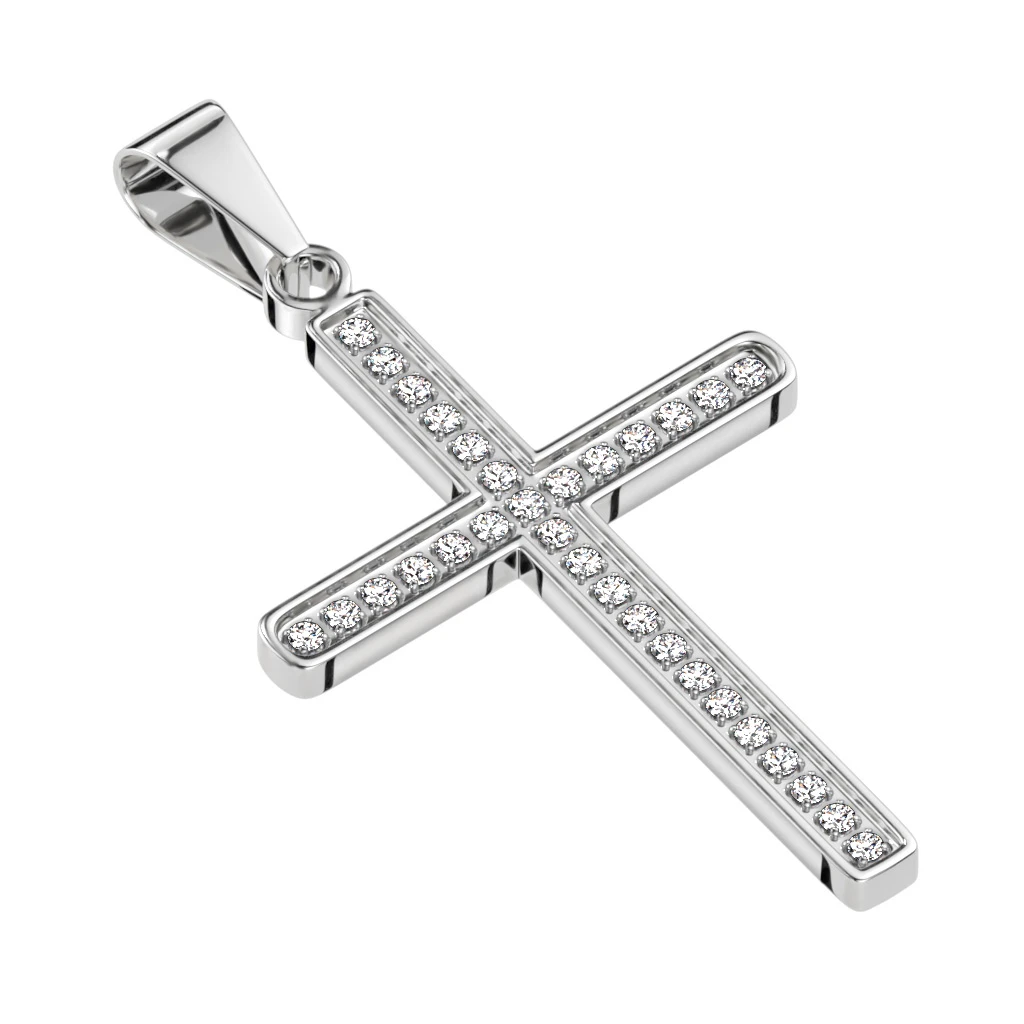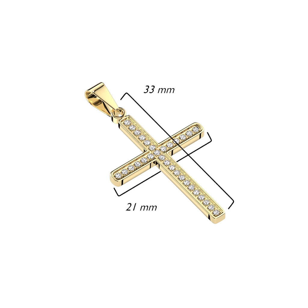 Přívěsek křížek na krk z chirurgické oceli. Povrch křížku je leštěný ozdobený zirkony. K přívěsku náleží ocelový řetízek. Rozměr kříže: 33x21mm.