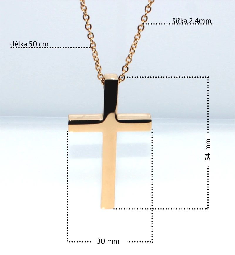 Přívěšek z chirurgické oceli kříž s ocelovým řetízkem. Povrch přívěsku křížku je leštěný upravený na černou technologií IP. Velikost křížku 54x30mm, délka řetízku 50cm, šířka řetízku 2,4mm. Řetízek se zapíná pomocí karabiny. Délku řetízku je možné na přání zdarma zkrátit.
