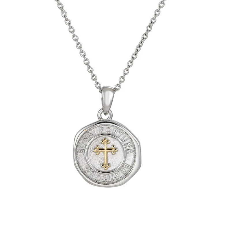 Přívěsek na řetízek z chirurgické oceli mince. Přívěsek je ozdobený křížem a nápisem "Bona Fortuna Beatitudo". K přívěsku náleží řetízek z chirurgické oceli dlouhý 55 cm. Průměr přívěsku 18 mm.
