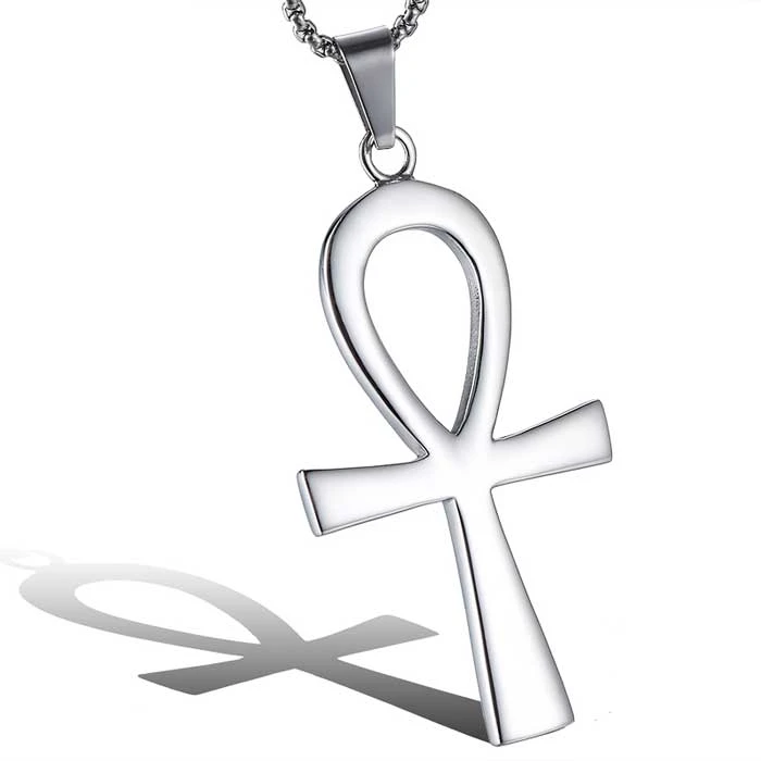 Ocelový přívěsek nilský kříž. Nilský kříž je hieroglyf z Egypta a má význam pozemského a věčného života. Povrch kříže je leštěný. Rozměr přívěšku 52x23mm. K přívěsku náleží řetízek z chirurgické oceli vzor pancr dlouhý 60 cm, šířka ocelového řetízku 3,0mm.