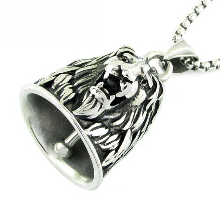 Ocelový přívěšek zvoneček pro štěstí s hlavou lva. Přívěsek je na ocelovém řetízku s průměrem 3mm. Řetízek je dlouhý 60cm. Rozměr zvonečku 24x34mm.