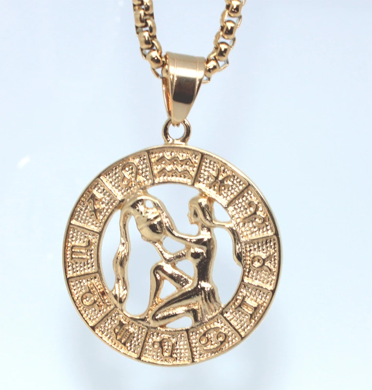 Náhrdelník se znamením vodnáře (21.1 - 20.2). Přívěsek a řetízek je vyrobený z pozlacené chirurgické oceli. Znamení vodnáře je "lemováno" symboly ostatních znamení zvěrokruhu. Součástí náhrdelníku je řetízek vzor veneziana se zapínáním na karabinu, dlouhý 60cm.Průměr přívěsku 30mm. Délku řetízku je možné na přání zdarma zkrátit.