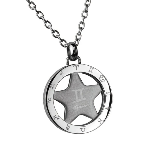 Ocelový přívěsek se znamením Blíženci (22.5 - 21.6). Znamení je umístěné do středu matné hvězdy, která se otáčí v leštěném orámování, na kterém jsou zobrazené symboly všech znamení horoskopu. Průměr přívěsku 25mm.