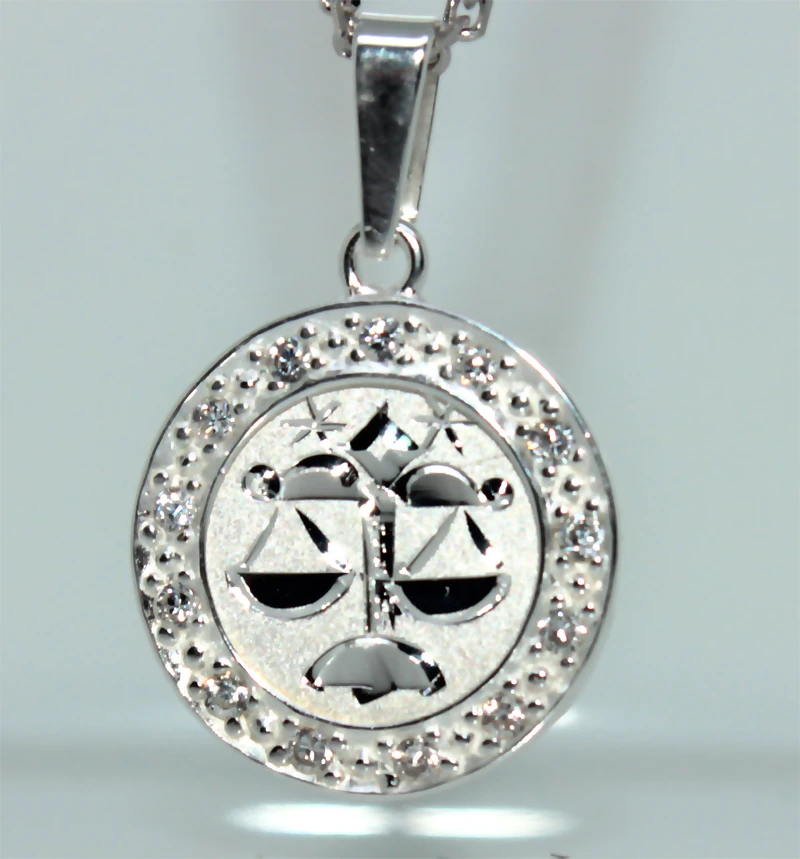 Přívěšek ze stříbra 925/000 se znamením Váhy (24.9-23.10). Průměr přívěsku 16 mm. Závěsným očkem na přívěsku lze protáhnout stříbrný řetízek s průměrem do 1,5 mm. Vyryté znamení je dokola ozdobené zirkony.