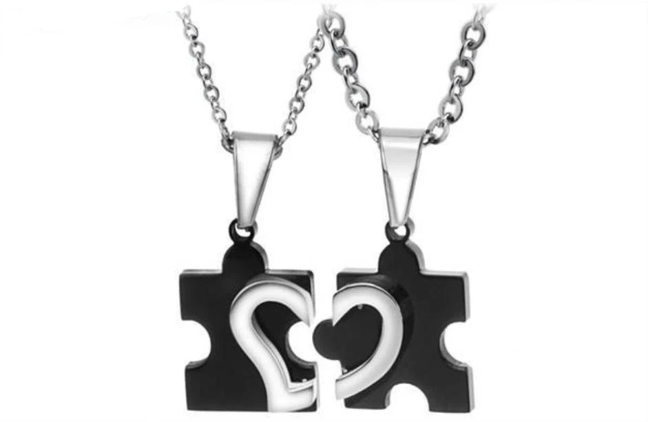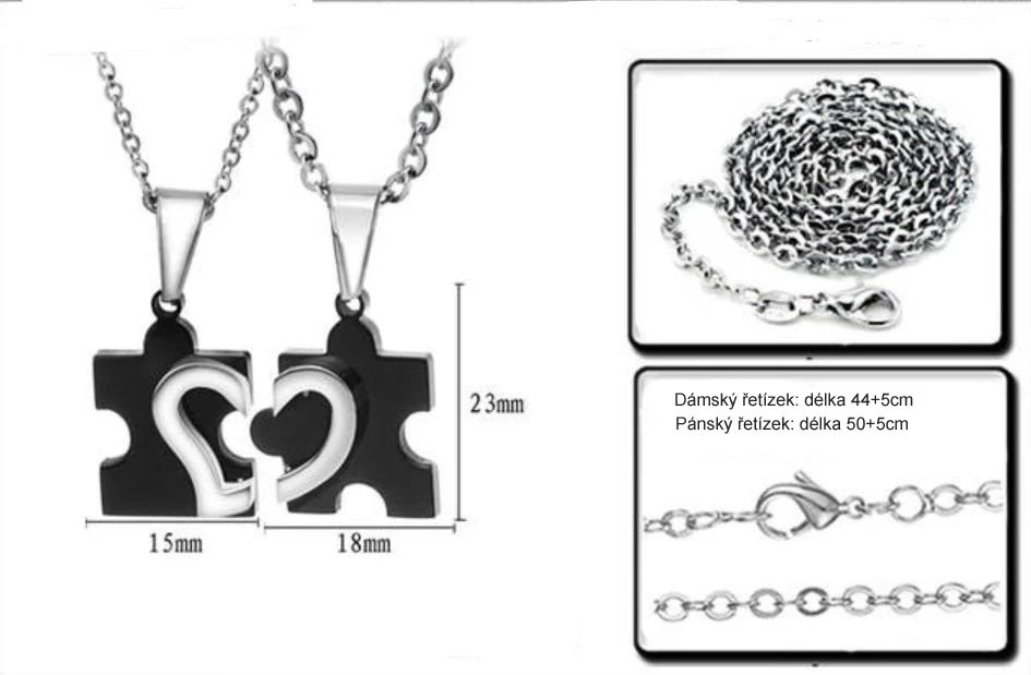 Ocelové přívěšky pro dva. Přívěsky tvoří dvě části puzzle se srdíčkem, které do sebe zapadají a tvoří tak jeden celek. K přívěskům patří řetízky z chirurgické oceli. Dámský řetízek má průměr 2,2mm, délka 44+5cm. Průměr pánského řetízku 3,2mm, délka 50+5cm.