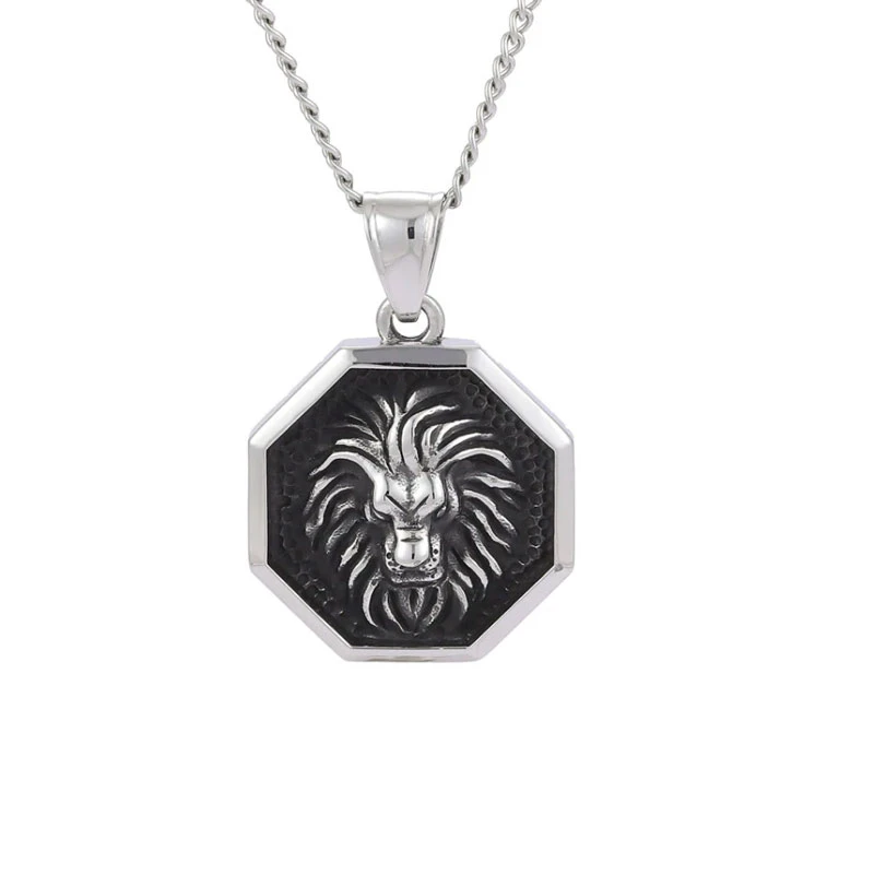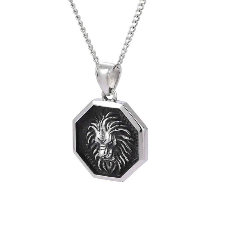 Pánský přívěsek z chirurgické oceli se lví hlavou. Hlava lva je umístěna v osmihranu na černám pozadí. K přívěsku náleží ocelový řetízek vzor ankr dlouhý 55cm. Rozměr přívěsku 25 x 25 mm.