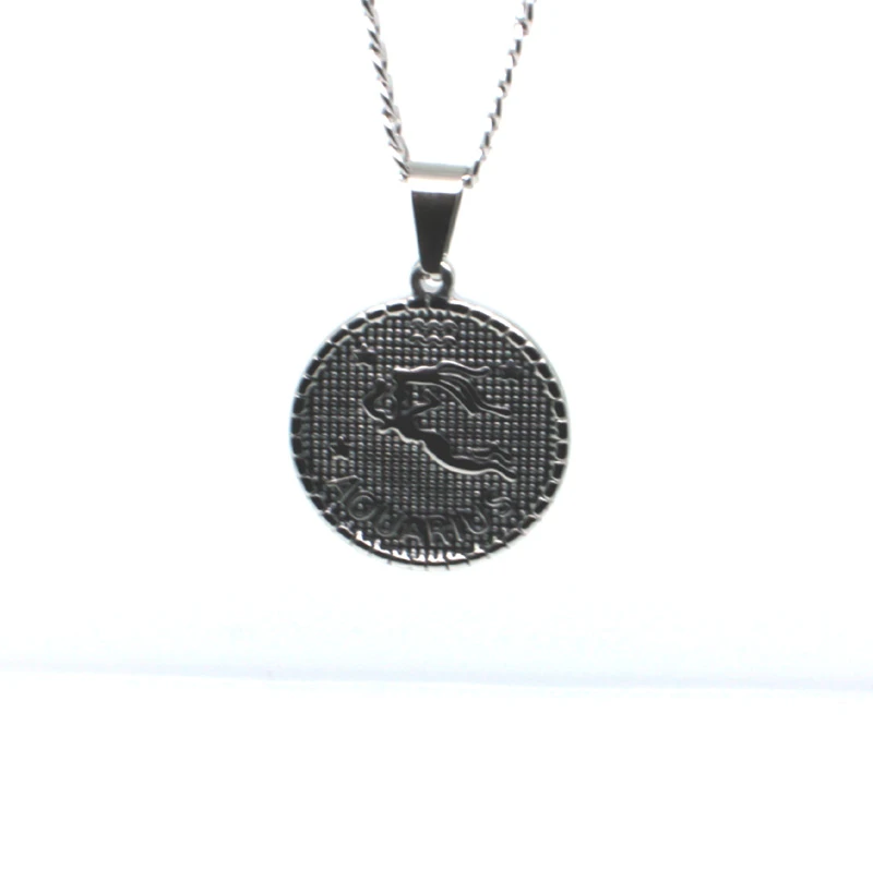 Přívěsek se znamením Vodnář (21. ledna – 20. února) vyrobený z chirurgické oceli. Znamení Vodnáře je plastické na černo-stříbrném podkladě. Přívěsek má průměr 25mm. K přívěsku se znamením náleží řetízek z chirurgické oceli dlouhý 60cm.