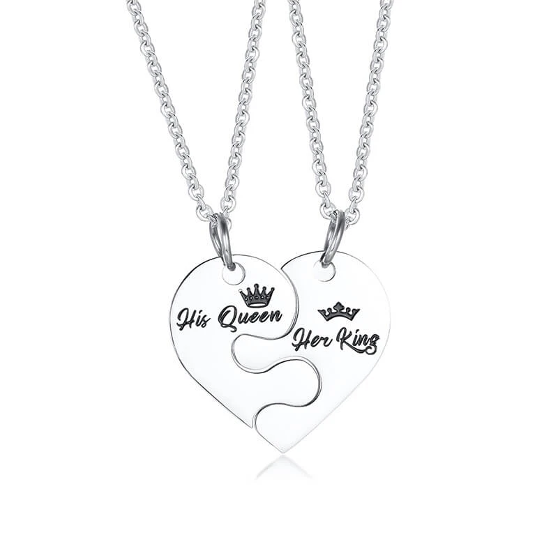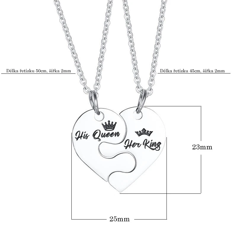 Ocelové přívěsky pro zamilované. Přívěsky společně tvoří jedno srdce. Část určená pro něj nese nápis "His Queen" a je zavěšená na řetízku v délce 50cm, část určená pro ni nese nápis "Her King" a je zavěšená na řetízku v délce 45cm.