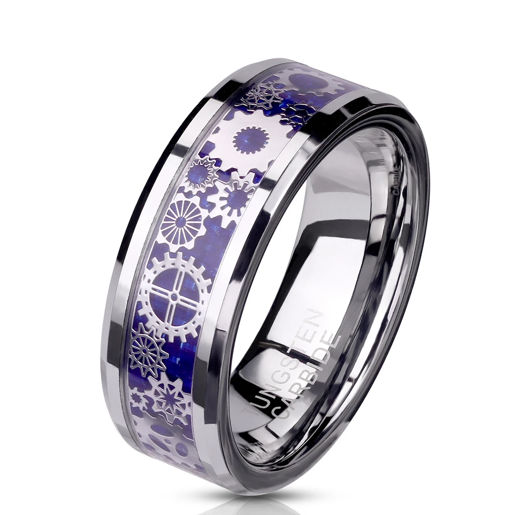 Pánský prsten zhotovený z wolframu. Prsten pro muže s industriálním vzorem ozubeného soukolí. Šířka prstenu 8mm.