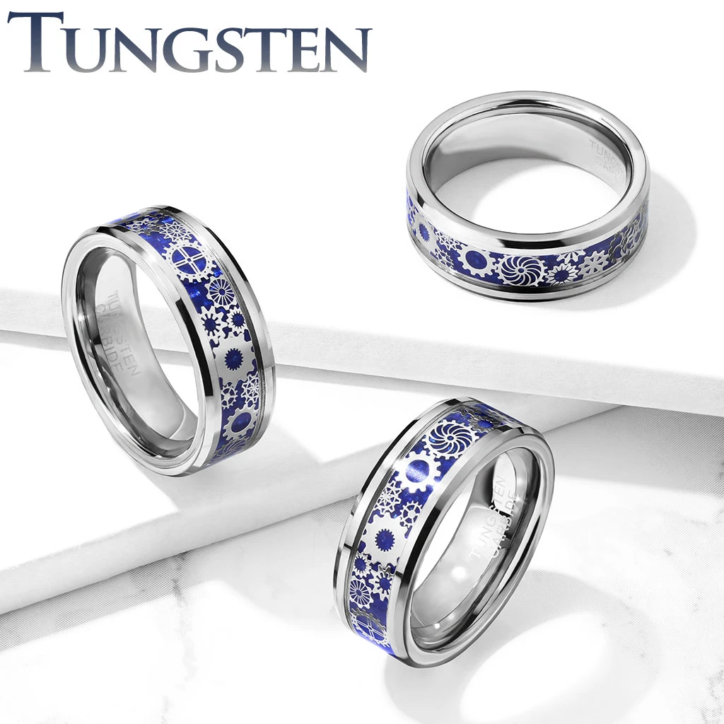 Moderní prsten pro muže z wolframu se vzorem ozubeného soukolí. Wolfram se řadí mezi kovy s vysokou hustotou, proto šperky z něj vyrobené jsou velmi odolné proti mechanickému poškození.