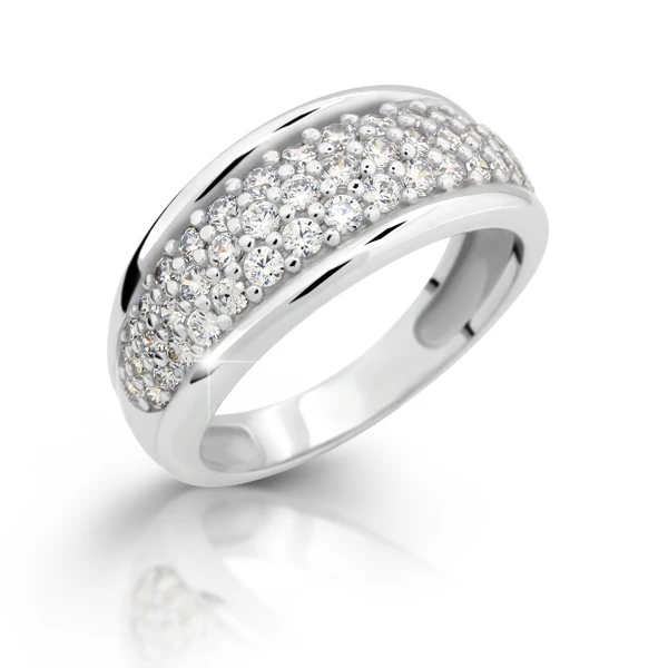 Stříbrný prsten ozdobený zářivými zirkony. Prsten má porhodiovaný povrch. Nanesené rhodium dodává prstýnku jasnou barvu a lesk. Ozdoba prstenu je široká 8,0 mm, v nejužším bodě je obroučka prstenu široká 3,0 mm.