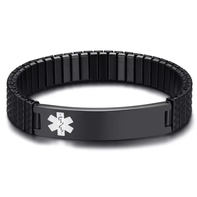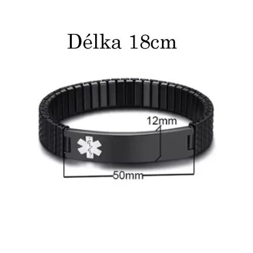 Pružný náramek z chirurgické oceli, který může ochránit život Váš, nebo život Vašich blízkých. Díky zdravotním údajům, které je možné vyrýt do destičky vedle lékařského symbolu budou v případě potřeby lékaři znát potřebné údaje.