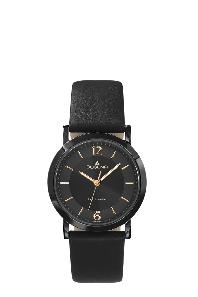 Dámské elegantní ocelové hodinky Dugena s koženým řemínkem, sklíčko hodinek je minerální. Kulatý černý ciferník s arabskými číslicemi a indexy. Hodinky jsou řízené radiovým signálem. Hodinky disponují hodinovou, minutovou a vteřinovou ručkou. Pouzdro hodinek má průměr 31,5 mm, tloušťka pouzdra 9 mm. Provoz hodinek zajišťuje spolehlivý bateriový strojek řízený radiovým signálem. Hodinky jsou vodotěsné na úrovni 5 ATM. Na veškeré dámské hodinky Dugena platí záruka v délce 36 měsíců. Hodinky jsou balené v dárkové krabičce s logem.