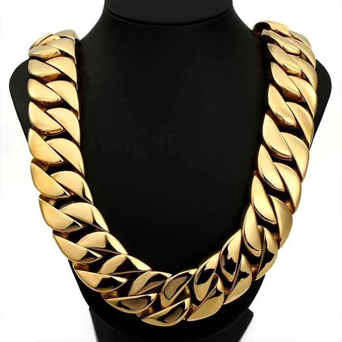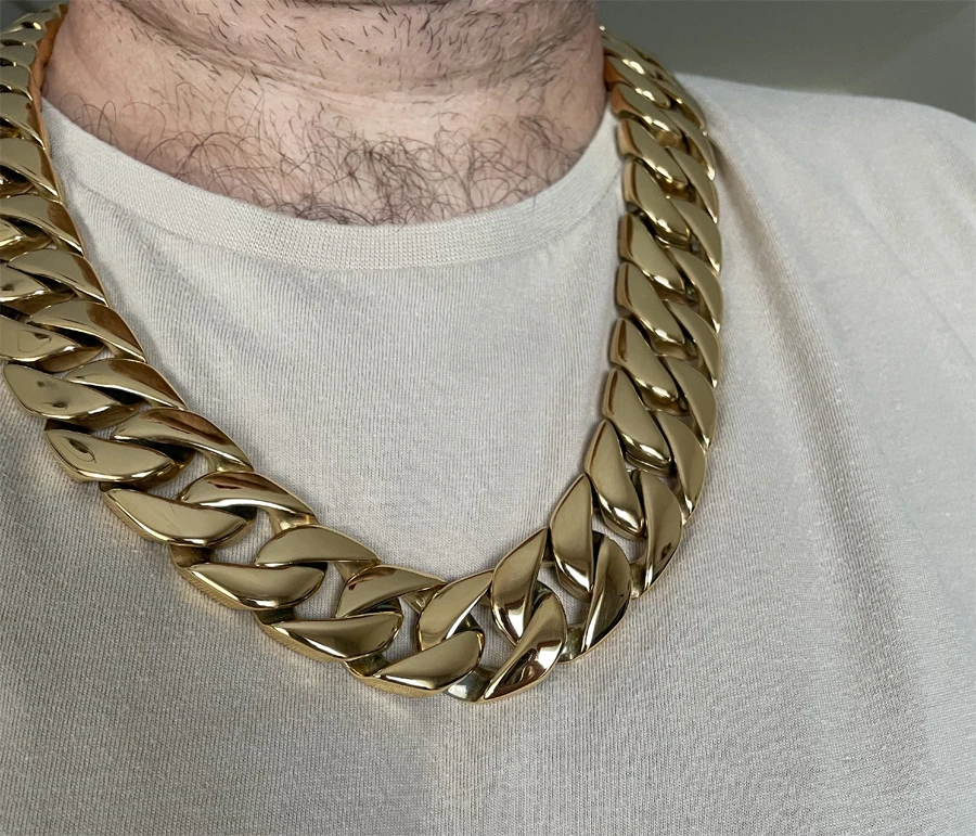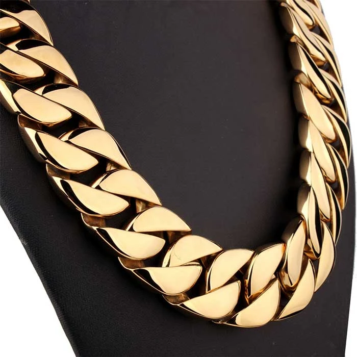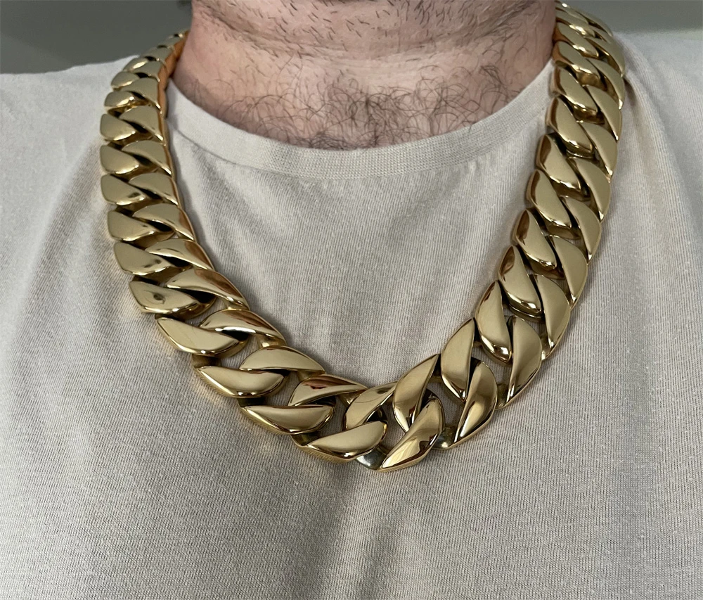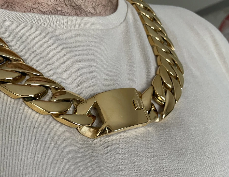 Pánský řetěz na krk z chirurgické oceli. Povrch řetízku je leštěný pozlacený technologií PVD. Řetízek je široký 25mm. Délka řetězu 70cm. Zapínání řetízku je masivní klip. Hmotnost řetězu 550g.