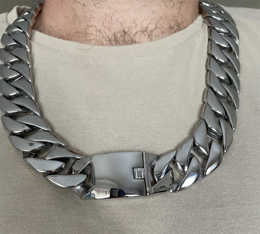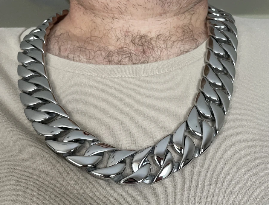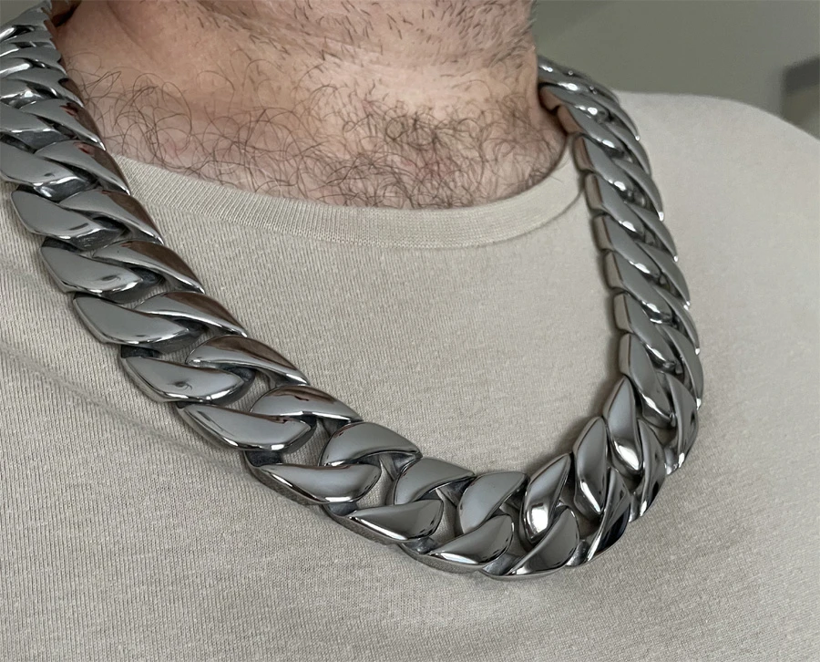 Pánský řetěz na krk z chirurgické oceli. Povrch řetízku je leštěný. Řetízek je široký 25mm. Délka řetězu 70cm. Zapínání řetízku je masivní klip. Hmotnost řetízku 550g.