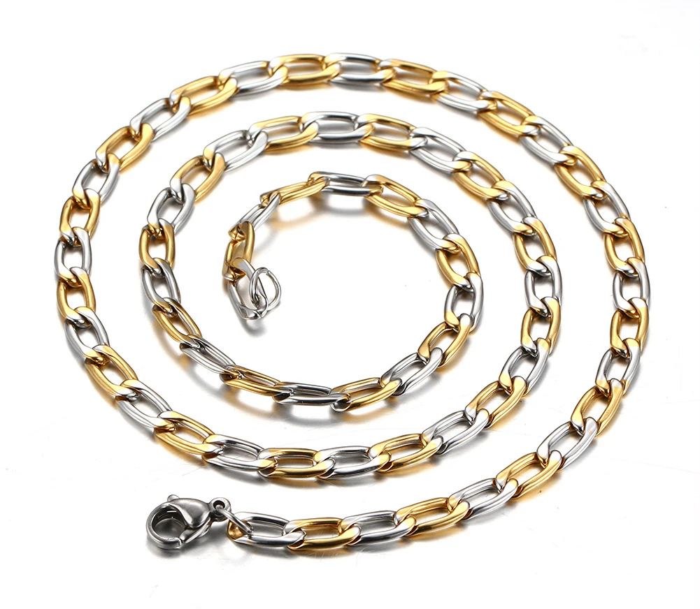 Ocelový řetízek se zlatou PVD barvou. Oka řetízku mají rozměr 5x9 mm. Zapínání řetízku je karabinové. Délka řetízku 47 cm. Řetízek lze přání zdarma zkrátit.