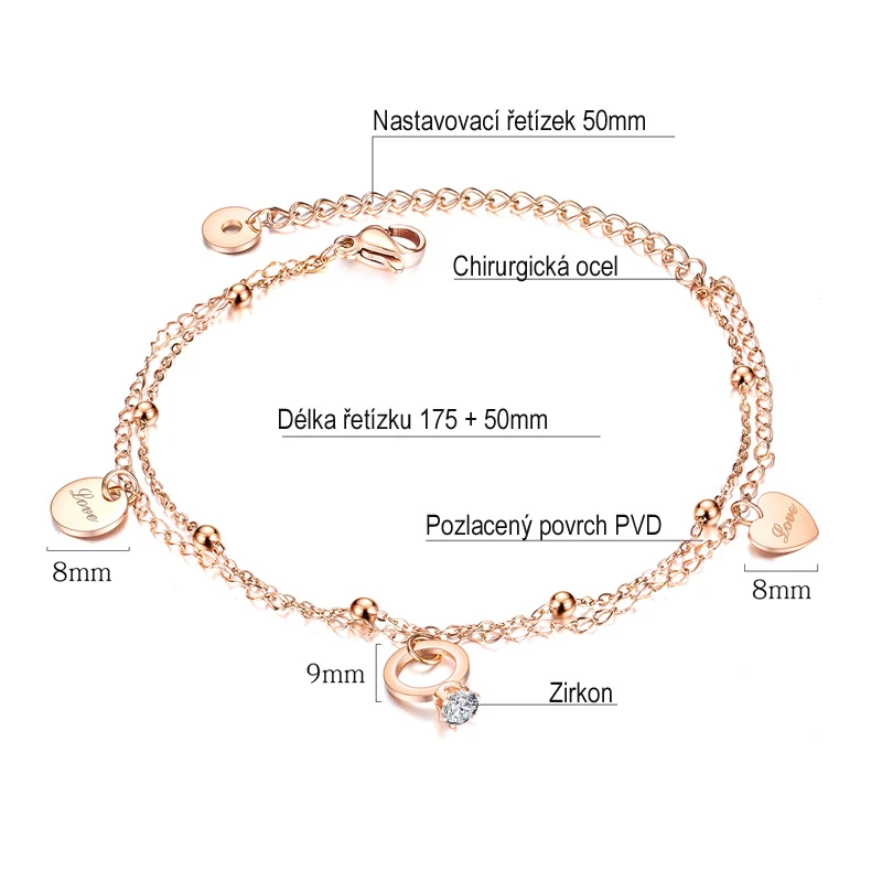 Řetízek na nohu z chirurgické oceli se zirkonem. Povrch náramku je leštěný. Délku řetízku lze plynule nastavit v rozmezí 17,5-22,5 cm. Zapínání náramku na kotník je karabinové.