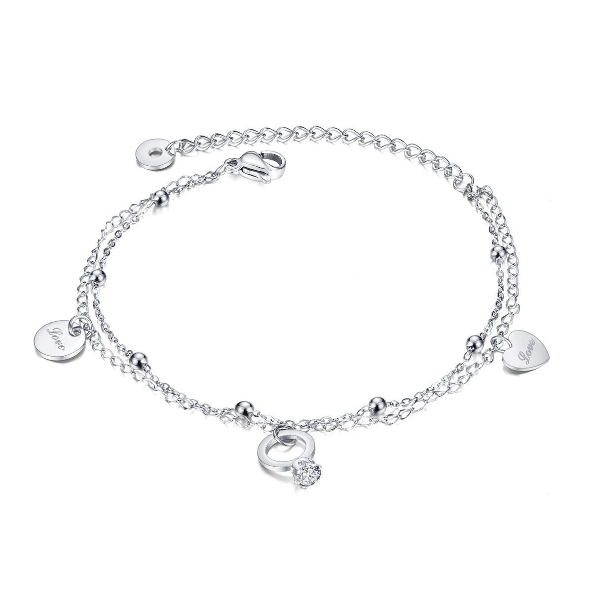 Ocelový řetízek na nohu s leštěným povrchem, kamínkem a srdíčkem.