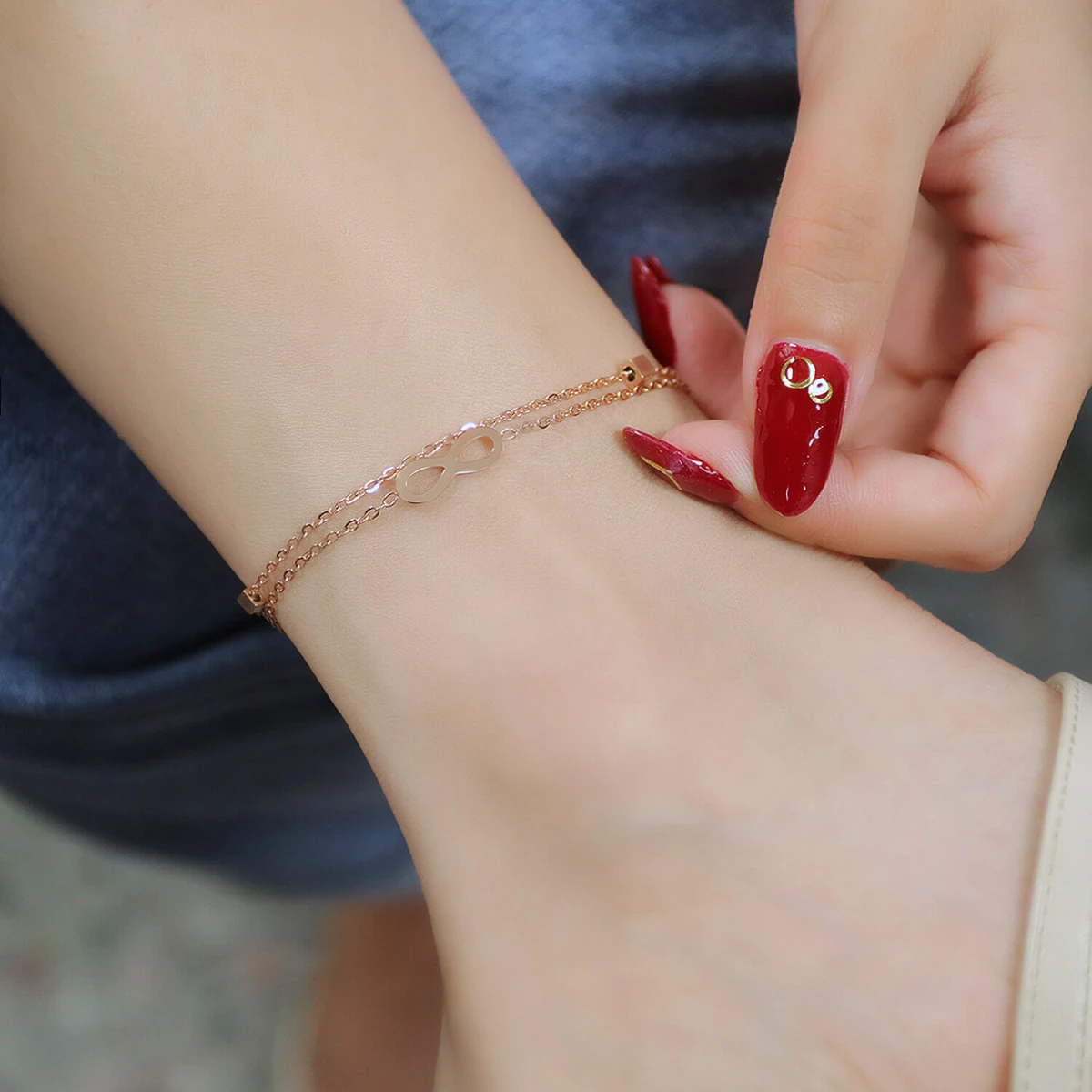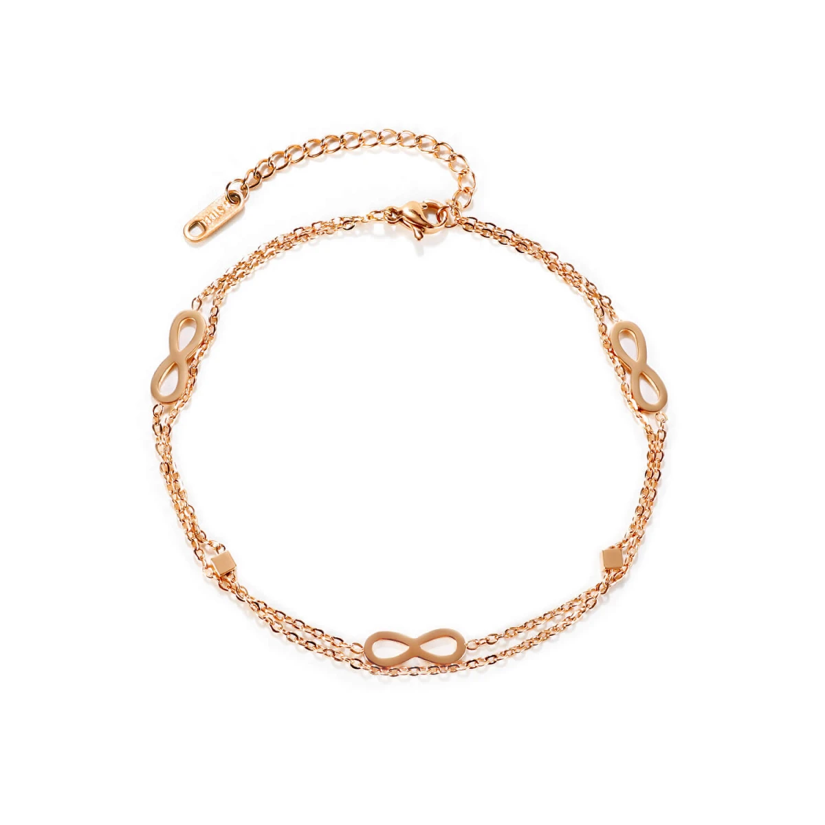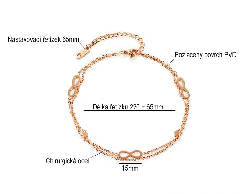 Ocelový řetízek na kotník se symboly nekonečna. Povrch řetízku je leštěný. Délku řetízku lze plynule nastavit v rozmezí 22-28,5 cm. Zapínání řetízku je karabinové.