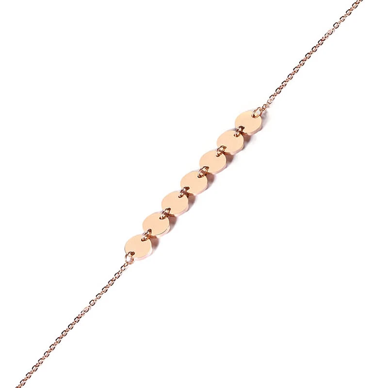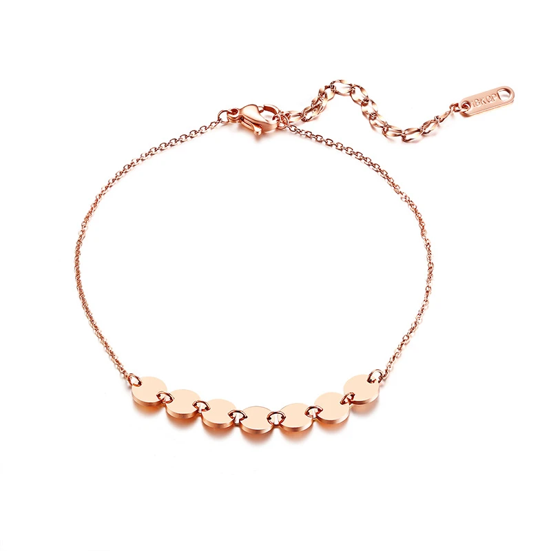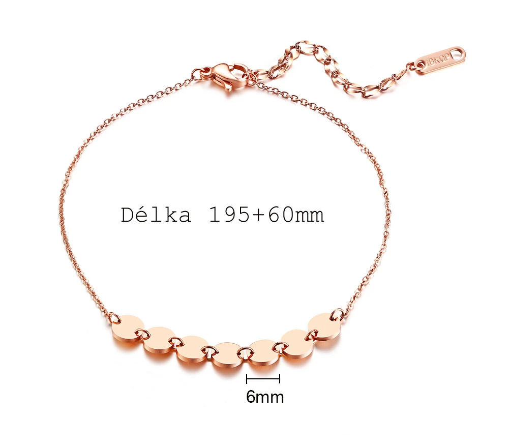 Řetízek na kotník z chirurgické oceli. Povrch řetízku je upravený IP barvou růžového zlata. Délku řetízku lze plynule nastavit v rozmezí 19,5-25,5 cm. Zapínání náramku na kotník je karabinové.