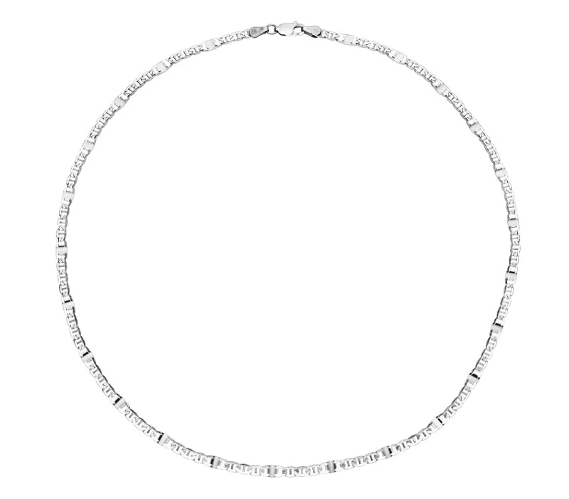 Řetízek ze stříbra ryzosti 925/1000. Povrch řetízku je porhodiovaný. Úprava rhodiováním dodává řetízku jasnou barvu s leskem, chrání povrch šperku proti poškrábání a ten tak bude mít dlouhou dobu bezvadný vzhled. Větší články jsou široké 4mm, menší 3mm. Řetízek má zapínání na karabinku.