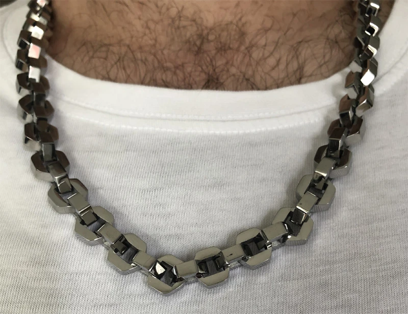 Pánský ocelový řetízek na krk. Masivní řetízek s leštěným povrchem. Délka řetězu 62cm, šířka 10mnm. Řetízek se zapíná pomocí karabiny.