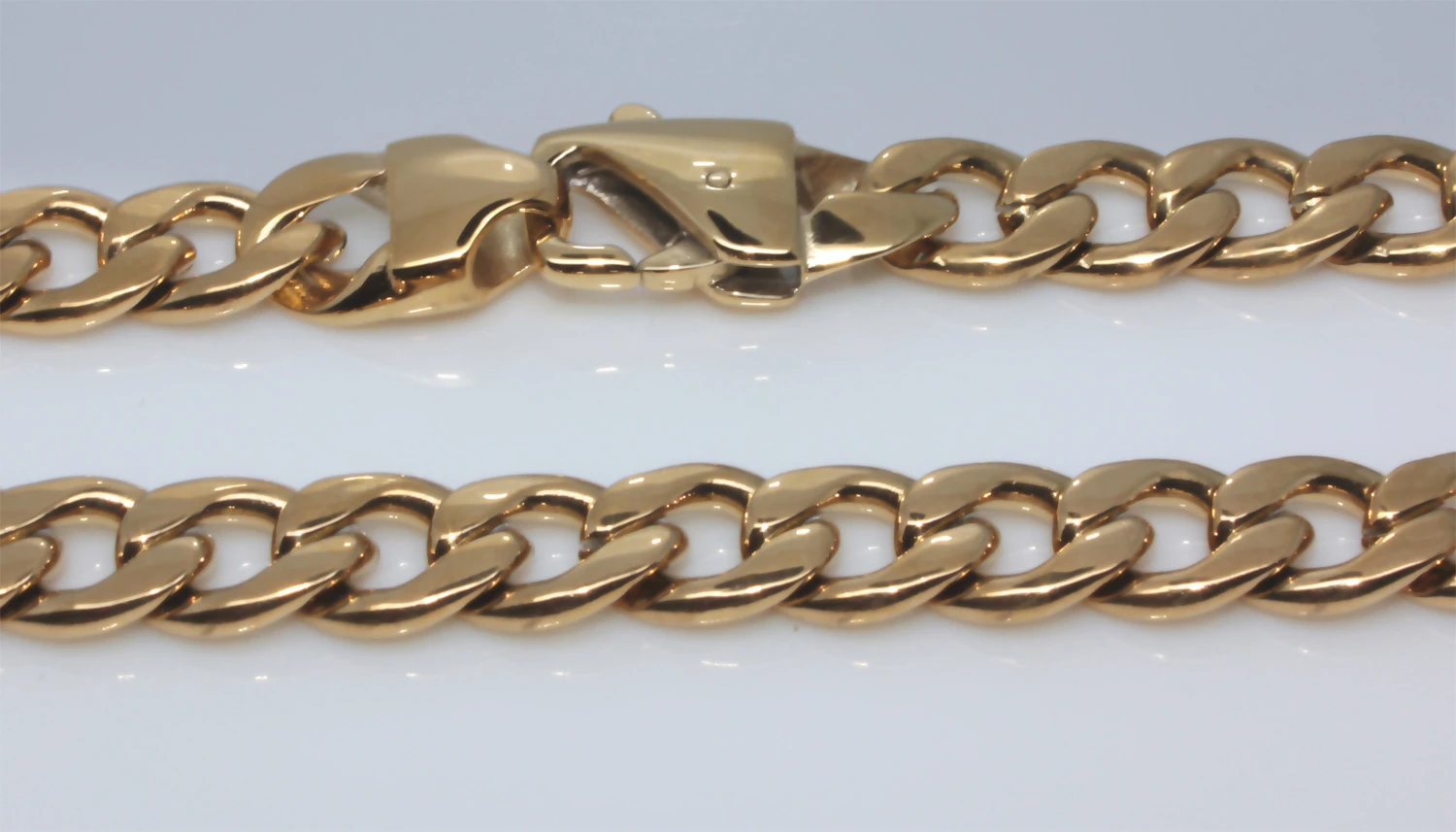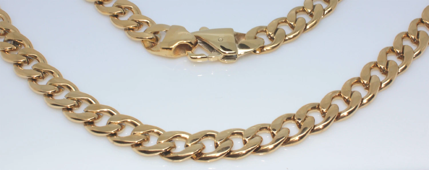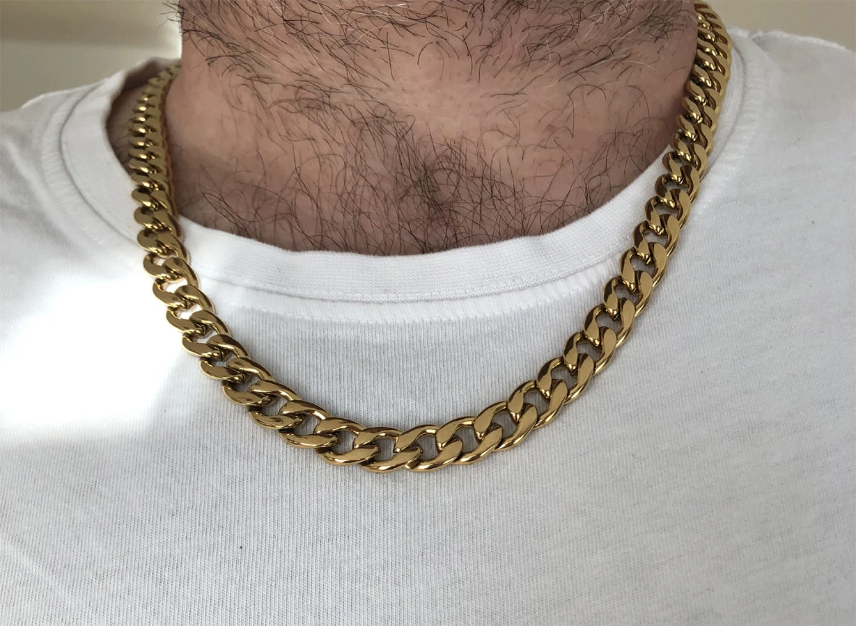Pánský řetízek z chirurgické oceli. Povrch řetízku je leštěný pozlacený technologií PVD. Řetízek se zapíná pomocí karabiny. Šířka řetízku 10mm. Klasický pánský řetízek vzor Pancr.