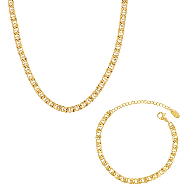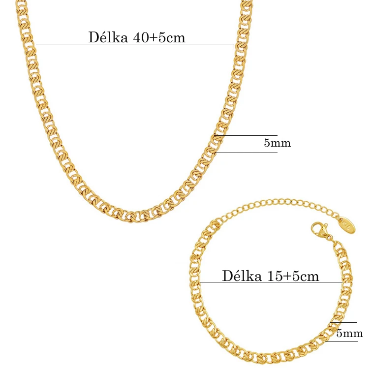 Set šperků z chirurgické oceli. Povrch šperků je pozlacený technologií PVD. Náhrdelník je široký 5mm, délku náhrdelníku lze nastavit v rozmezí 40-45cm. Náramek je široký 5mm, délku náramku lze nastavit v rozmezí 15-20cm.