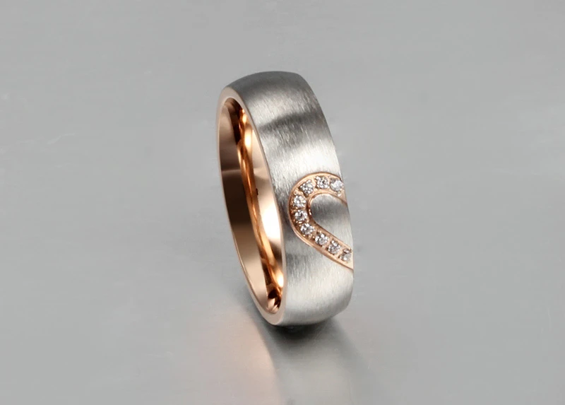 Ocelové snubní prsteny se srdíčkem. Dámské snubní prsteny osazené zirkony jsou ve velikostech 49-57. Pánské snubní prsteny s černou polovinou srdce jsou dostupné ve velikostech 59-67. Snubní prsteny široké 6 mm.