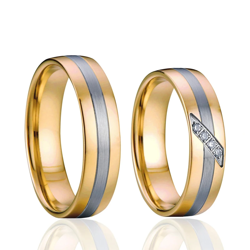 Snubní prstýnky z chirurgické oceli. Povrch prstenů je kombinace lesk-mat. Prsten má matný stříbrný střed s pozlacenými leštěnými okraji, z vnitřní strany je prsten leštěný. Zlacení je provedeno technologií IP. Dámské prstýnky ve velikostech 49-57 jsou osazené fasovanými zirkony. Pánské prsteny ve velikostech 59-70 jsou bez zirkonů. Prstýnky jsou široké 6mm. Uvedená cena platí za jeden snubní prsten. Dámský snubní prstýnek se zirkony je za jinou cenu nežli pánský snubní prsten bez zirkonů.