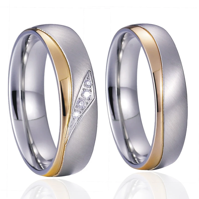 Snubní prstýnky z chirurgické oceli. Povrch prstenů v barvě oceli je matný, pozlacená část prstýnků je leštěná. Prsteny pro dámy jsou zdobené fasovanými zirkony a jsou ve velikostech 49-57, pánské prsteny jsou bez kamínků a jsou dostupné ve velikostech 59-70. Uvedená cena platí za jeden snubní prstýnek. U dámského snubního prstýnku s kamínky je cena jiná nežli u pánského snubního prstýnku bez kamínků.