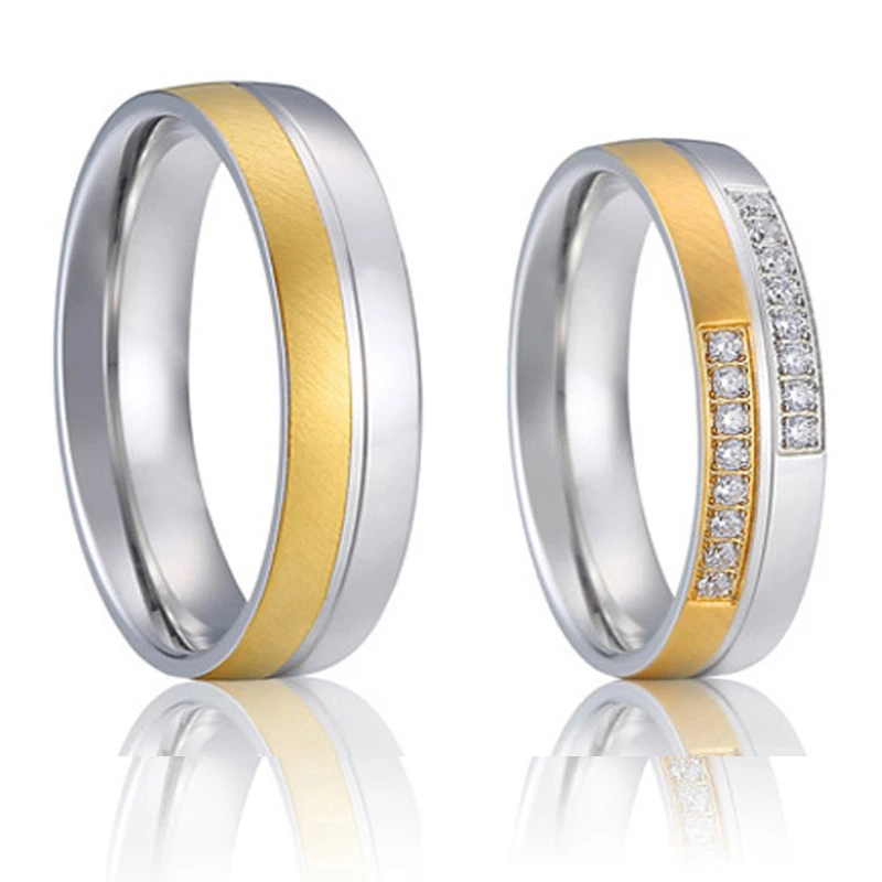 Snubní prstýnky z chirurgické oceli. Snubní prsteny s povrchem leštěným a zlatým proužkem po celém obvodu. Prsteny pro dámy jsou zdobené fasovanými zirkony a jsou ve velikostech 49-57, pánské prsteny jsou bez kamínků a jsou dostupné ve velikostech 59-70. Uvedená cena platí za jeden snubní prstýnek. U dámského snubního prstýnku s kamínky je cena jiná nežli u pánského snubního prstýnku bez kamínků.