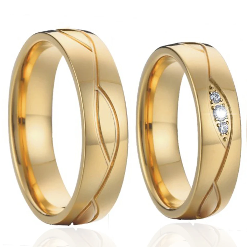 Snubní prstýnky z chirurgické oceli. Snubní prsteny s pozlaceným a leštěným povrchem. Prsteny pro dámy jsou zdobené fasovanými zirkony a jsou ve velikostech 49-57, pánské prsteny jsou bez kamínků a jsou dostupné ve velikostech 59-70. Uvedená cena platí za jeden snubní prstýnek. U dámského snubního prstýnku s kamínky je cena jiná nežli u pánského snubního prstýnku bez kamínků.