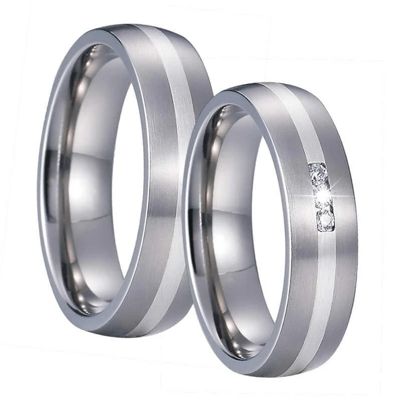 Svatební prstýnky z titanu. Prsteny pro dámy jsou zdobené zirkony a jsou ve velikostech 49-57 (u tohoto modelu je možné koupit velikost 57 bez zirkonů), pánské prsteny jsou bez kamínků a jsou dostupné ve velikostech 59-67. Uvedená cena platí za jeden snubní prstýnek. U dámského snubního prstýnku s kamínky je cena jiná nežli u pánského snubního prstýnku bez kamínků.