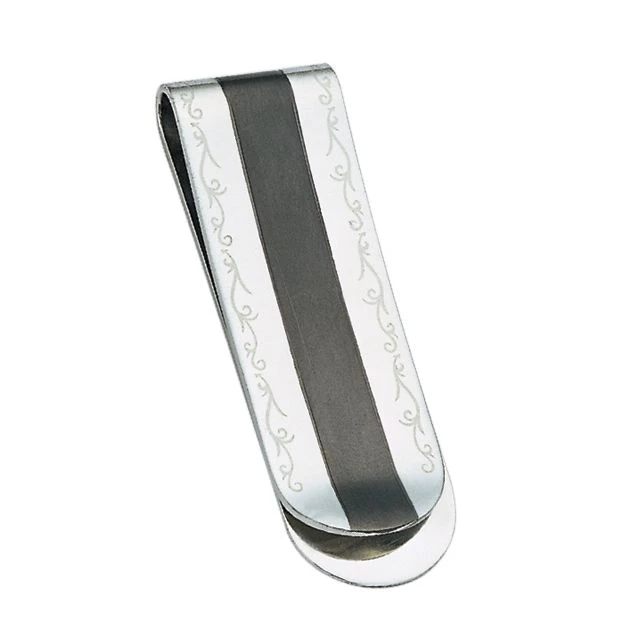 Spona na peníze z chirurgické oceli 316L. Povrch spony je leštěný zdobený černým pruhem a gravírováním po obou stranách. Rozměr spony na peníze 50×16×1mm.