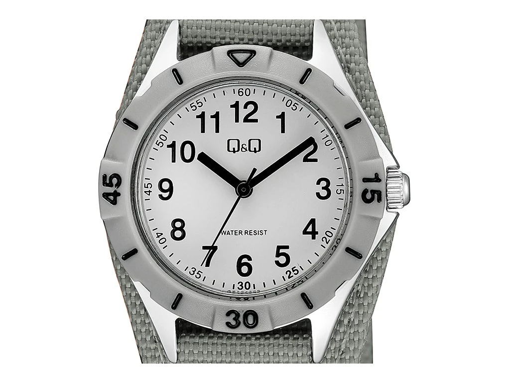 Náramkové hodinky s nylonovým řemínkem na suchý zip. Pouzdro z kovu má průměr 30mm. Šedý ciferník s černým číselníkem má průměr 20mm. Hodinky disponují hodinovou, minutovou a vteřinovou ručkou. Provoz hodinek zajišťuje spolehlivý bateriový strojek. Hodinky jsou vodotěsné na úrovni 3ATM mohou tedy přijít do styku s vodou. Jednoduché hodinky s přehledným ciferníkem, které se díky pohodlnému nylonovému řemínku snadno nosí.