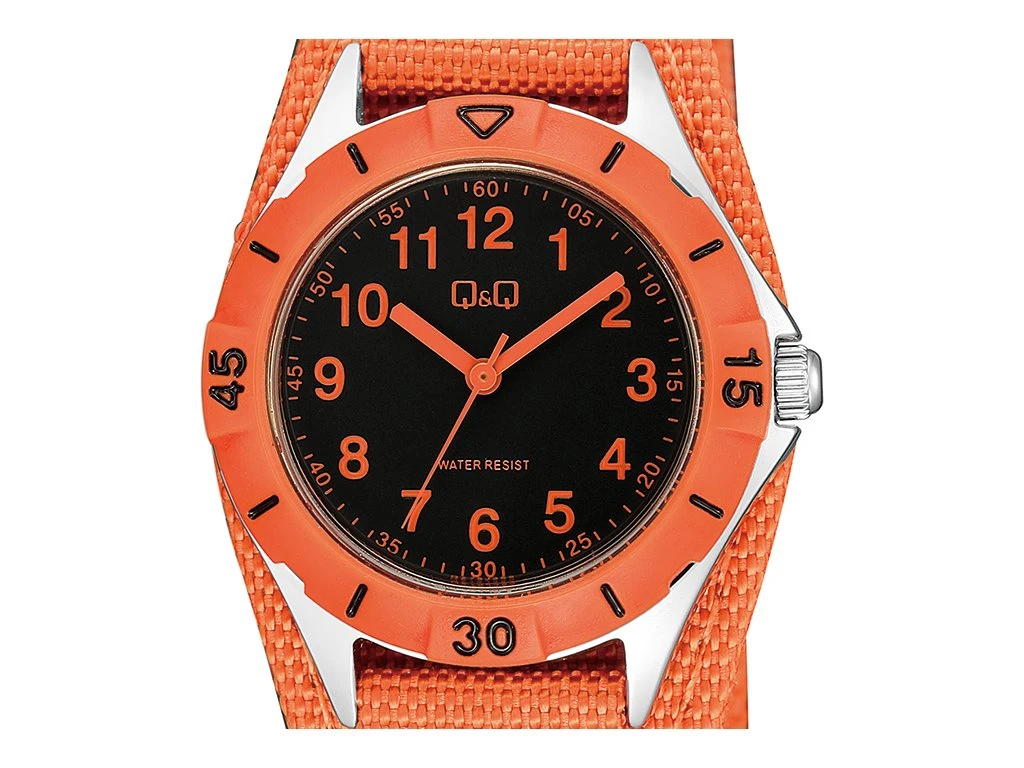 Náramkové hodinky s nylonovým řemínkem na suchý zip. Pouzdro z kovu má průměr 30mm. Černý ciferník s oranžovým číselníkem má průměr 20mm. Hodinky disponují hodinovou, minutovou a vteřinovou ručkou. Provoz hodinek zajišťuje spolehlivý bateriový strojek. Hodinky jsou vodotěsné na úrovni 3ATM mohou tedy přijít do styku s vodou. Jednoduché hodinky s přehledným ciferníkem, které se díky pohodlnému nylonovému řemínku snadno nosí.